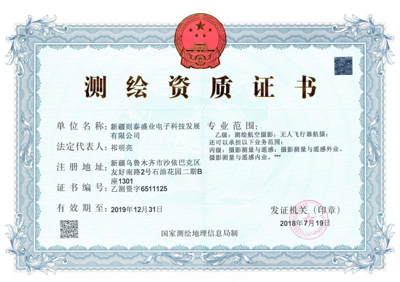 | 發證機構: | 新疆維吾爾自治區測繪地理信息局 | 發證時間 : | 2018-07-19 |