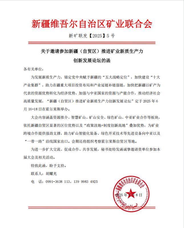 關(guān)于邀請參加新疆(自貿(mào)區(qū))推進(jìn)礦業(yè)新質(zhì)生產(chǎn)力 創(chuàng)新發(fā)展論壇的函