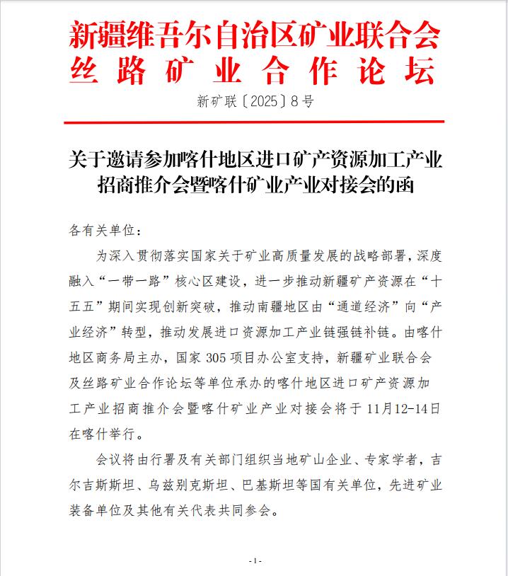 關于邀請參加喀什地區進口礦產資源加工產業招商推介會暨喀什礦業產業對接會的函