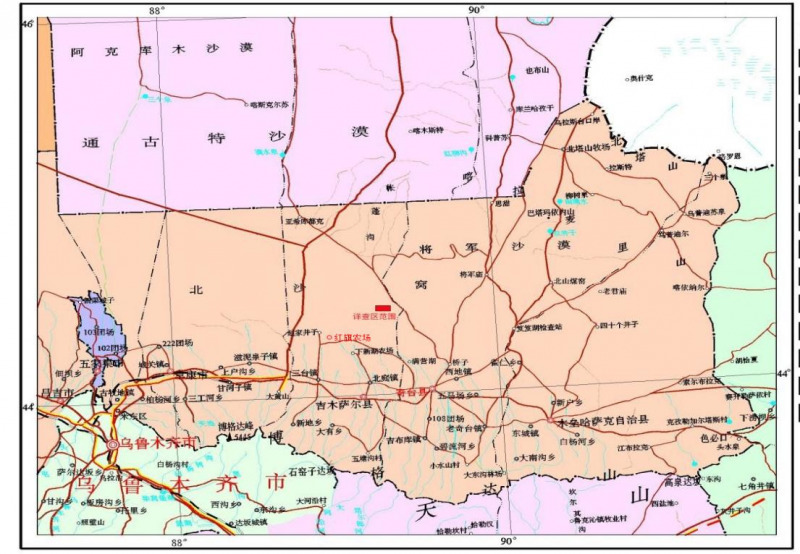 地理位置:準(zhǔn)噶爾盆地東南部古爾班通古特沙漠邊緣,行政區(qū)劃隸屬新疆生產(chǎn)建設(shè)兵團(tuán)第六師管轄,位于五家渠市東側(cè)130km處,吉木薩爾縣場(chǎng)北側(cè)35km處,距紅旗農(nóng)場(chǎng)場(chǎng)部約16km。自紅旗農(nóng)場(chǎng)場(chǎng)部經(jīng)二幸線鄉(xiāng)村公路及便道可直接到達(dá)詳查區(qū)的北部,交通較為便利。范圍:東經(jīng)89°11′46.00″~89°12′54.00″;北緯44°17′46.00″~44°18′50.00″。