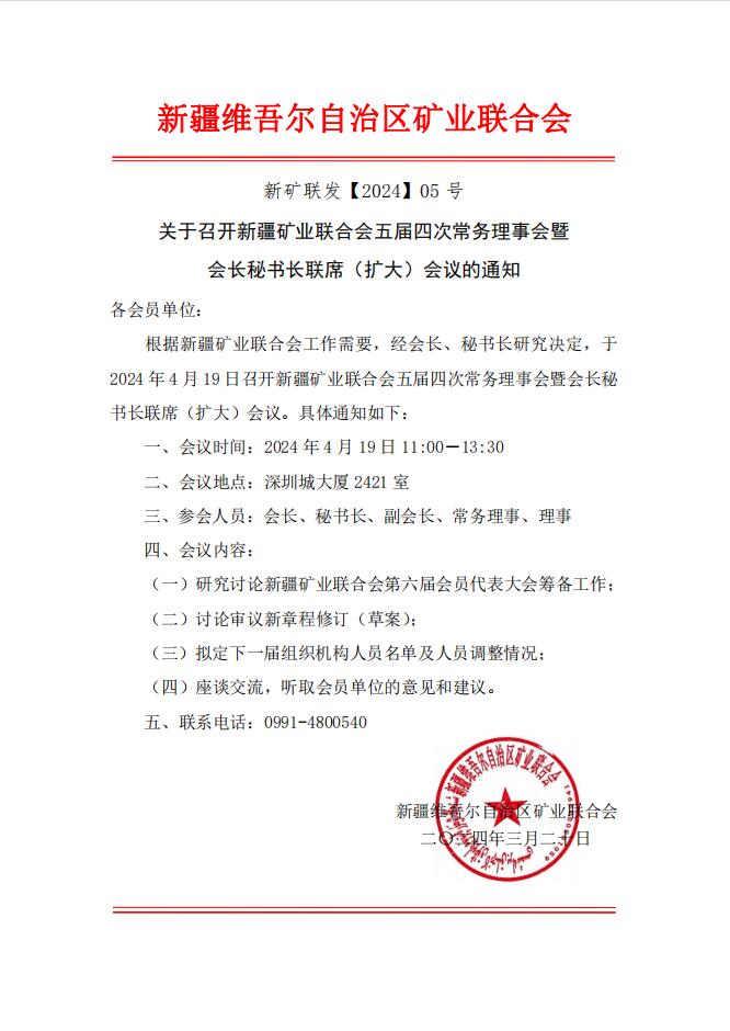 關于召開新疆礦業聯合會五屆四次常務理事會暨 會長秘書長聯席(擴大)會議的通知